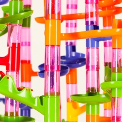 Set omogućuje gradnju stabilnih tornjeva, spiralnih tobogana i tunela. Izvrsni vizualni efekt i gladak prolaz kuglica zajamčeni.