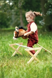 Plišani konjić na štapu Nico idealan je pratitelj za male jahače. Nježna plišana glava s uzdom i povodcima poziva na maštovitu igru, dok drveni štap sa stabilnim ručkama i kotačićima osigurava udobno i glatko kretanje po podu i na otvorenom. Djeca će doživjeti autentičniji ugođaj zahvaljujući zvučnom efektu – pritiskom na uši konjić veselo rzaje.