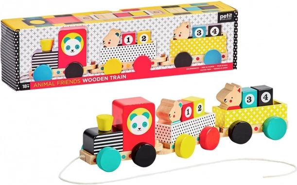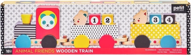 Ovaj moderni drveni vlakić ima lokomotivu i dva vagončića, četiri kocke s brojkama i dva slatka životinjska prijatelja. Djeca ga mogu vući uzicom, slagati i preslagivati kocke i figurice te tako razvijati maštu, logiku te finu i grubu motoriku.