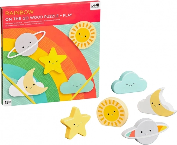 Izdržljive drvene slagalice za najmlađe od 18 mjeseci. 5 drvenih dijelova, 2 igraće scene i veseli motiv duge potiču finu motoriku, koncentraciju i radost otkrivanja. Izrađeno od drveta i recikliranog papira.