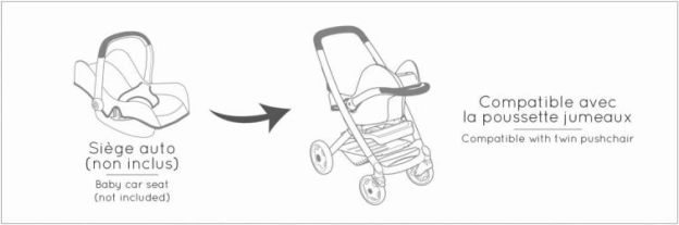 Jednostavnim otkapčanjem košare kolica pretvorite u trenu. Gornji dio može poslužiti kao košara/nosiljka za lutku na putu.