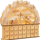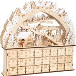 Doživite čaroliju Božića s drvenim adventskim kalendarom koji prikazuje slikovito selo! Detalji poput snježnih kućica, drvaca, skijaša i snjegovića razveselit će vas svaki dan. Ladice kalendara možete napuniti malim darovima ili slasticama za djecu.