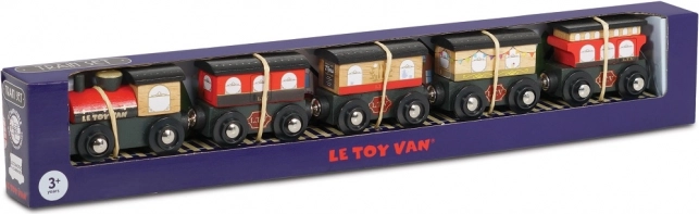 Stilski drveni vlak ROYAL EXPRESS od Le Toy Van oduševit će djecu i roditelje. Sadrži lokomotivu i pet vagona s magnetnim povezivanjem, izrađen je od održivog drva i obojan netoksičnim bojama na bazi vode. Potiče finu motoriku, maštovitu igru i kompatibilan je s većinom drvenih željezničkih setova.