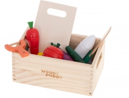 Šarena set drvenog povrća na magnete u praktičnom sandučiću razveselit će sve male kuhare. Djeca mogu sigurno isprobati „rezanje“ na dasci, „guljenje“ gulilicom i pripremu jela za lutke i plišance. Dijelovi se zahvaljujući magnetima lako spajaju i ponovno razdvajaju – razvijaju finu motoriku, uče brojanje i potaknu maštu u igri kuhanja. Izrađeno od glatko obrađenog drva i obojano netoksičnim bojama.