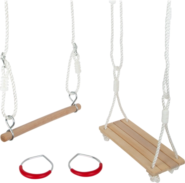 Ovaj multifunkcionalni set za male akrobate donosi aktivno kretanje i radost u vrt i dječju sobu. Klasična drvena ljuljačka, viseća prečka i gimnastički kolutovi s udobnim plastičnim rukohvatima potiču razvoj koordinacije, snage i ravnoteže.