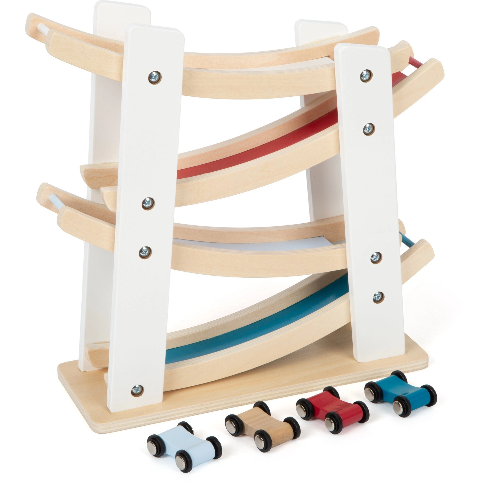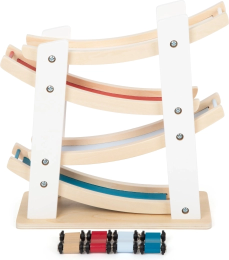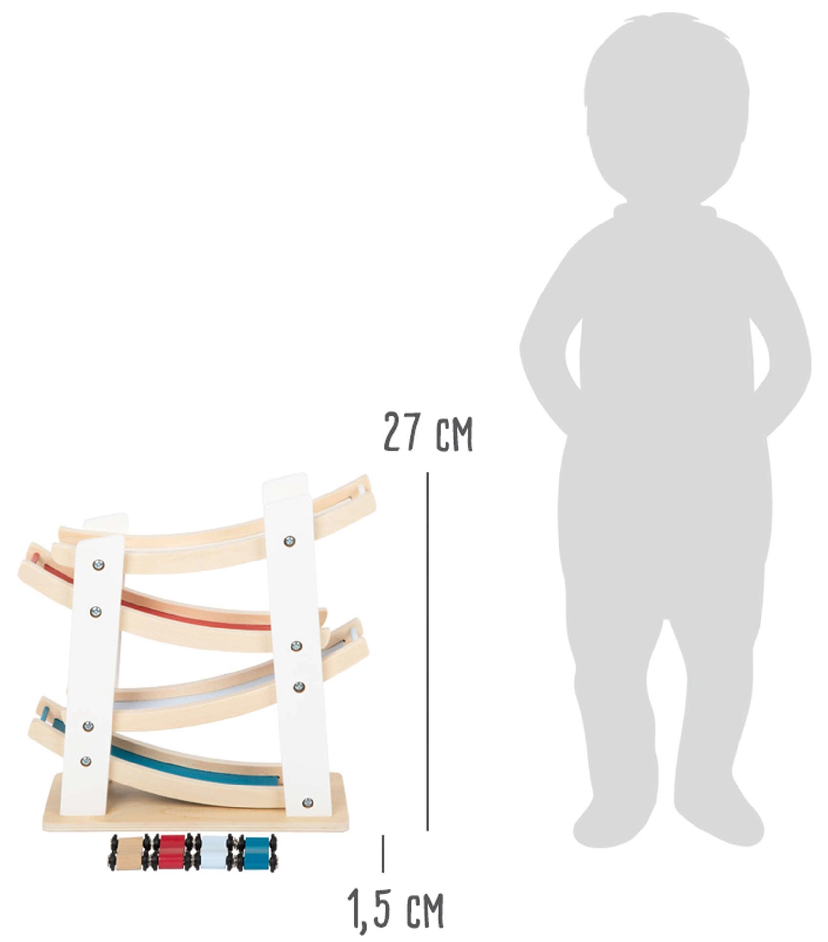 Otkrijte zabavu za najmlađe s drvenom trkaćom stazom s autićima od Small Foot. Robusna konstrukcija od prirodnog drva, četiri šarena autića i glatko spuštanje niz kaskadne rampe razvijaju finu motoriku, koordinaciju oko–ruka i razumijevanje uzroka i posljedice. Idealna igračka od 18 mjeseci za svakodnevnu kreativnu igru.