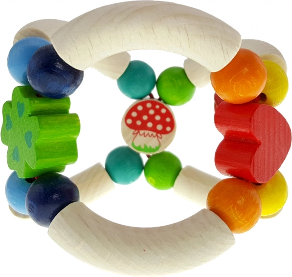 Drvena zvečka muhar izrađena je od kvalitetnog drva i metalnog zvonca. Moderna kombinacija boja i glatka obrada nježne su prema dječjim ručicama, dok lagana konstrukcija olakšava držanje. Igračka je prikladna za bebe od rođenja te potiče osjetilnu percepciju i prve namjerne pokrete.