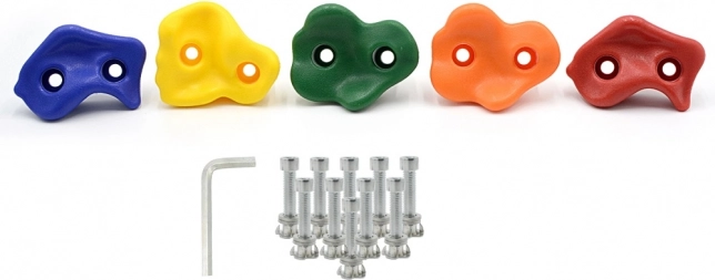 Ovo pakiranje sadrži pet čvrstih i izdržljivih penjačkih hvata s nosivošću do 100 kg. Idealni su za ugradnju na moderna dječja igrališta i vanjske igraće površine.