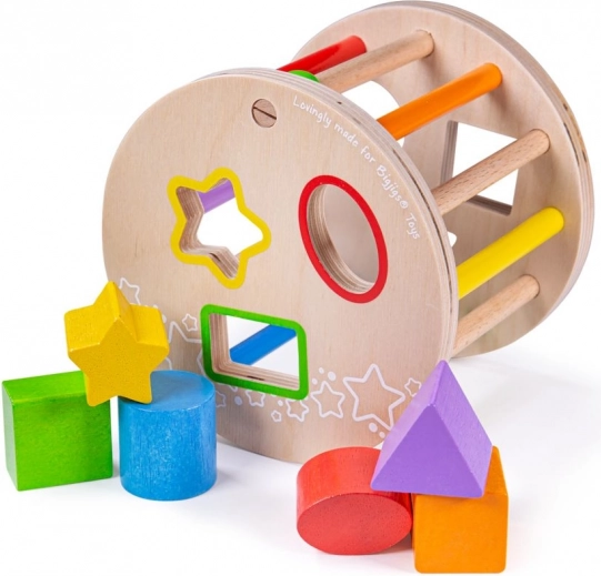 Ovaj drveni valjak s oblicima izvrstan je izbor za prvu edukativnu igračku. Šareni geometrijski dijelovi umeću se u odgovarajuće otvore, čime djeca vježbaju logičko razmišljanje, strpljenje i preciznost hvata. Pri kotrljanju po podu igračka ispušta ugodne klapkajuće zvukove koji potiču na daljnje istraživanje.