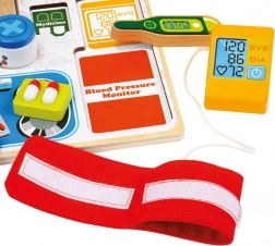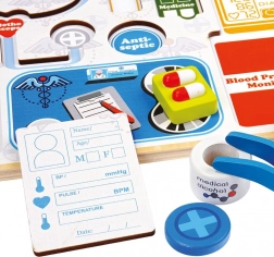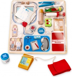 Ova šarena umetajuća slagalica brenda Bino djeci približava svijet zdravstva kroz igru. Zahvaljujući jasno oblikovanim dijelovima, djeca lako prepoznaju i pridružuju stetoskop, toplomjer, injekciju i druga pomagala na pravo mjesto na ploči. Tijekom igre vježbaju hvat, koncentraciju i strpljenje.