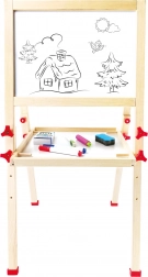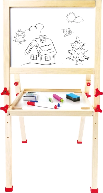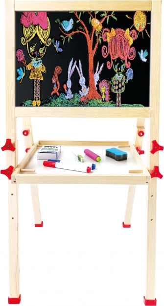 Ova kvalitetna dječja ploča kombinira bijelu magnetsku površinu za pričvršćivanje sličica i pisanje flomasterom s klasičnom školskom pločom za crtanje kredom. Zahvaljujući podesivoj visini i stabilnoj drvenoj konstrukciji raste s djetetom i odlično se uklapa u dječju sobu ili igraonicu.