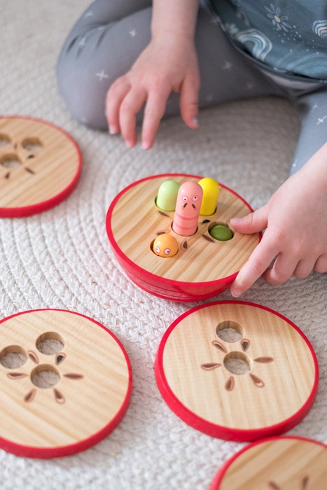 Svaka razina ima različit broj otvora – djeca slažu tako da odgovara broju crvića koji proviruju. Zabavan put prema logičkom razmišljanju i koncentraciji.