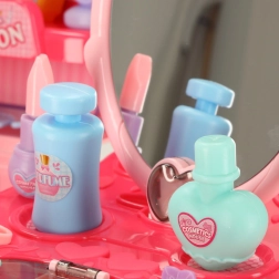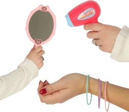 - Bogati set dodataka: ogledalce, češalj, dječje “sušilo”, ukosnice, prstenje, narukvice, naljepnice i bočice koje imitiraju lak za nokte i parfeme.