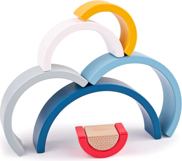 Drvena slagalica duga u živim bojama djeci nudi beskrajne mogućnosti građenja – od mostova i tunela do maštovitih konstrukcija. Svaki luk precizno pristaje jedan u drugi, što potiče koordinaciju ruka–oko i uči djecu razlikovati veličine i oblike.