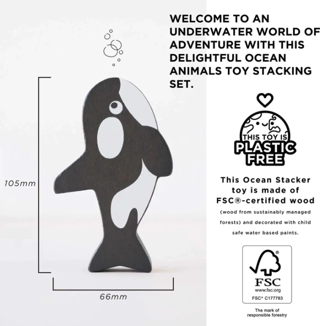 Izrada od certificiranog FSC drva, zaobljeni rubovi i boje na bazi vode osiguravaju maksimalnu sigurnost. Igračka je bez plastike i pakirana u praktičnom pamučnom vrećicu, pa je savršena za dom i putovanja. Priznanja Right Start Toy Award 2021 i The Veggie Award Finalist 2021 potvrđuju njezinu kvalitetu i održivost.