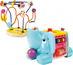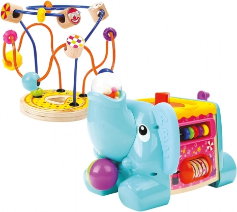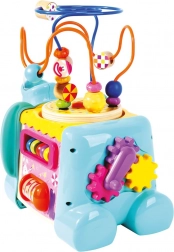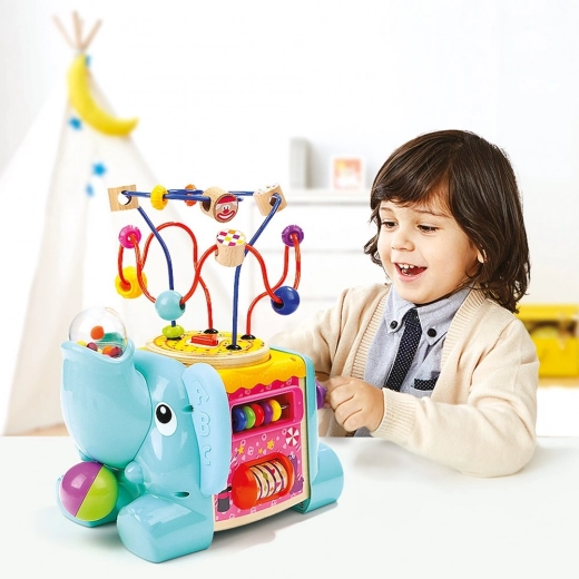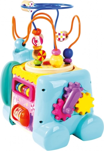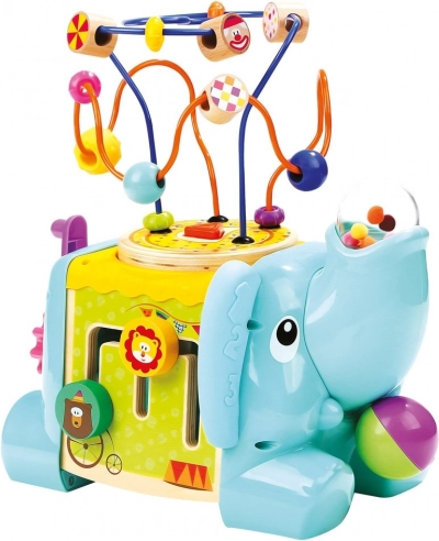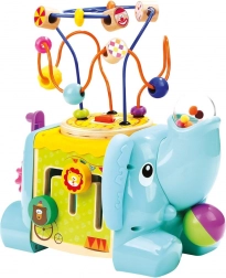 Ova višenamjenska motorička kocka u obliku slona idealna je edukativna igračka za najmlađe. Zahvaljujući šarenim elementima i raznolikim aktivnostima djeca prirodno vježbaju finu motoriku, prostornu percepciju i senzorne vještine. Gornji dio čini motorički labirint s perlicama, a stranice krase zupčanici, klizni dijelovi i druge pametne zadaće.