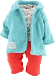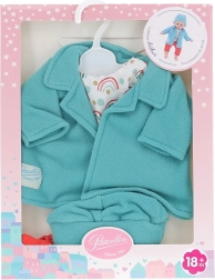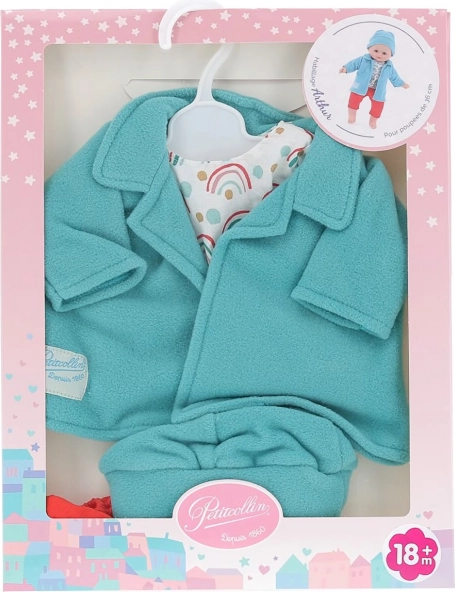 Stilna odjeća za lutku 36 cm brenda Petitcollin u dizajnu Arthur: tirkizna flis majica s kapuljačom, uzorčana bluza, crvene kratke hlače i kapica. Kvalitetna izrada, francuska elegancija i živopisne boje potiču maštu i radost u igri, dok jednostavno odijevanje mogu svladati i male ručice.
