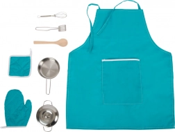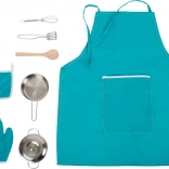 Ovaj jedinstveni set za kuhanje osmišljen je kako bi vaša djeca mogla sigurno, a istovremeno realistično doživjeti čaroliju kuhanja. Svaki dio seta izrađen je s obzirom na dječje ruke, što omogućuje jednostavno rukovanje i sigurnost tijekom igre. Dječja pregača s velikim prsnim džepom praktična je za spremanje kuhinjskog pribora i štiti malog kuhara od nečistoća.