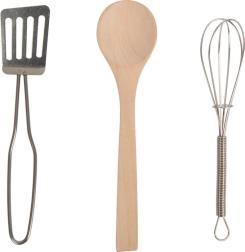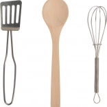 Sadrži lonac s poklopcem, tavu, pjenjaču, lopaticu i drvenu kuhaču koji pomažu pri igri kuhara.