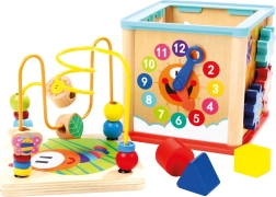 Ova šarena drvena motorička kocka nudi djeci od 12 mjeseci mnogo načina za igru i učenje. Zahvaljujući satu s kazaljkama djeca se kroz igru upoznaju s vremenom, labirint s perlicama razvija hvat i koordinaciju, a ostale strane kocke vježbaju logiku, oblike i boje.
