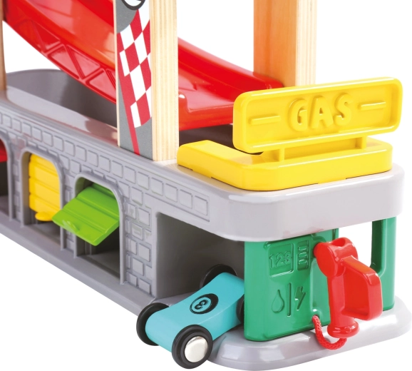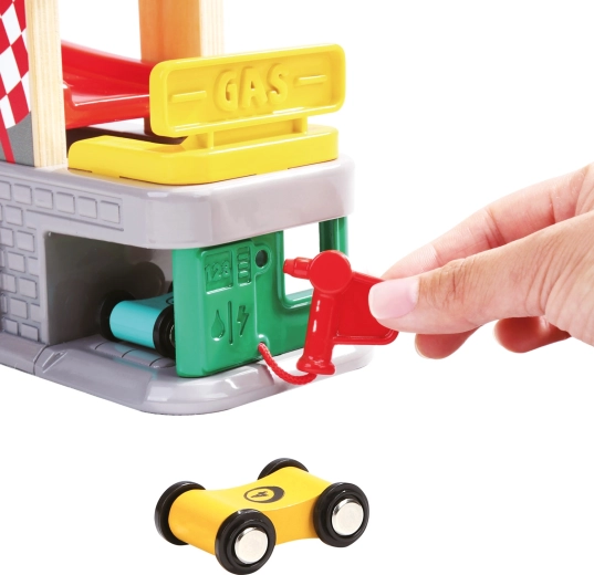 Tri garaže s otvarajućim vratima i stanica za točenje goriva potiču maštovite scenarije – od servisnih zaustavljanja do parkiranja i razvrstavanja autića.