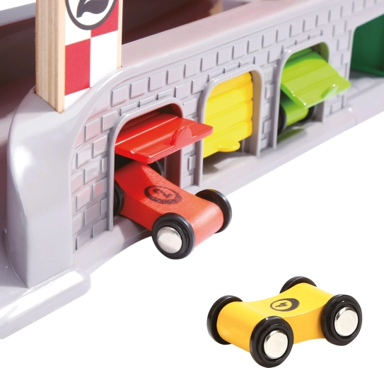 Pokrenite utrke punom brzinom s autostazom koja nudi dva startna podesta, pit boxeve za točenje goriva i tri garaže s otvarajućim vratima. Robusna kombinacija drva, plastike i metala jamči izdržljivost, dok žive boje privlače pažnju i potiču dječju maštu. U kompletu su 4 šarena autića za neiscrpnu dozu trkaće zabave.