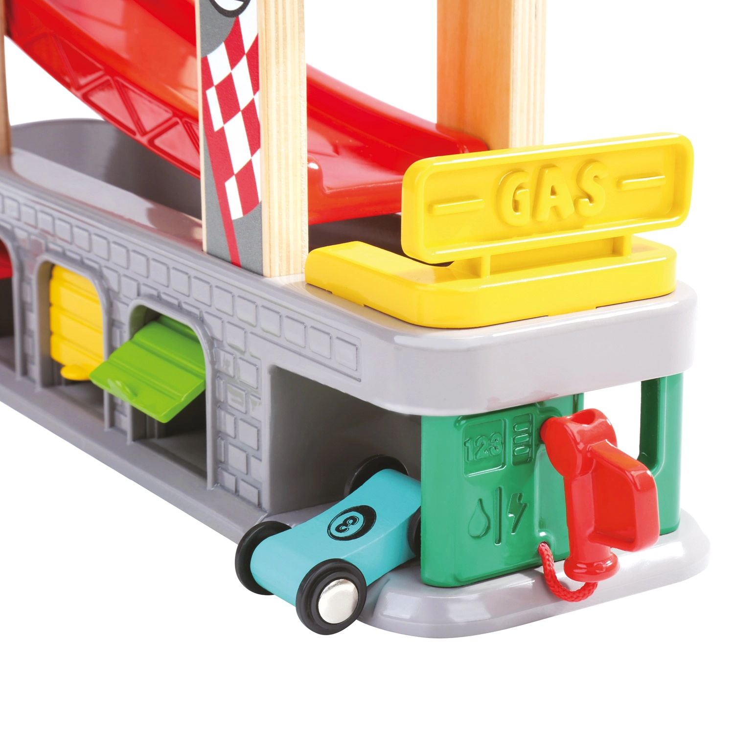 Ova šarena kaskadna autostaza donosi dinamičnu vožnju u kojoj jedan natjecatelj može tijesno pratiti drugoga. Djeca će uživati u glatkom spustu niz višerazinske rampe, točenju goriva u boxevima i parkiranju u garažama s preklopnim vratima. Zahvaljujući promišljenoj izradi, autostaza potiče finu motoriku, koordinaciju oko–ruka i razvoj mašte.