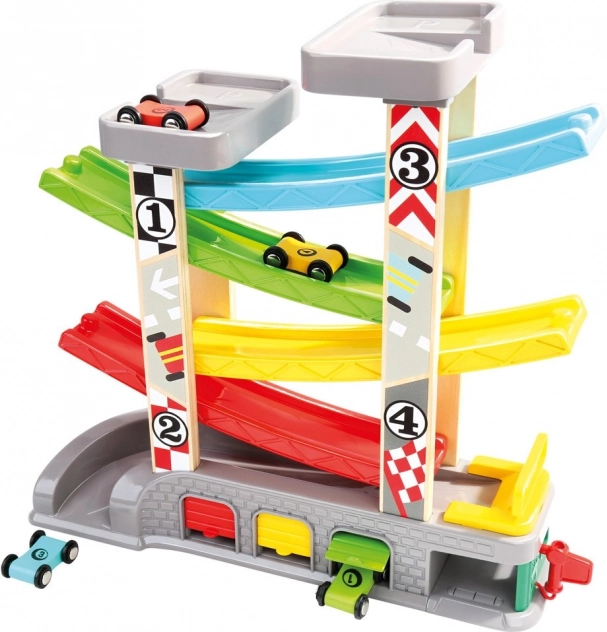 U podnožju staze nalaze se tri garaže s otvarajućim vratima, koje služe ne samo kao parkiralište, već i kao praktičan spremnik te mogućnost lakog prenošenja igračke. Robusna kombinacija drva, plastike i metala osigurava dug vijek trajanja i sigurnu igru, dok žive boje privlače pažnju i potiču znatiželju.