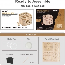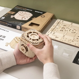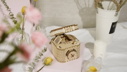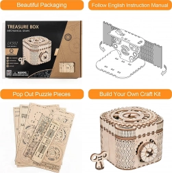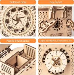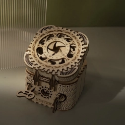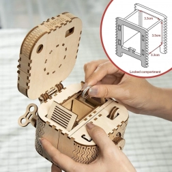 Drvena mehanička zagonetka kutija za nakit od šperploče je jedinstven poklon za ljubitelje ručnih radova i luksuznih dekoracija za interijer. Sastavljanje kutije je umjereno teško i predstavlja izvrstan izazov sa 123 precizno izrezana dijela. Kutija sadrži dva pretinca, uključujući glavni zaštićen trocifrenim kodom, koji se može birati iz mnogih kombinacija po želji korisnika.