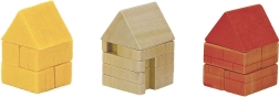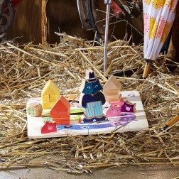 Robusni drveni dijelovi i šareni oblici potiču na gradnju kućica i slaganje vuka. Djeca prirodno razvijaju finu motoriku i maštu.