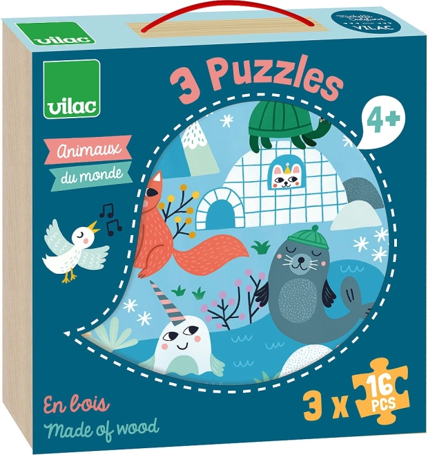 Tri slikovne puzzle s motivima savane, šume i ledene sante predstavljaju djeci svijet životinja u njihovu prirodnom okruženju.
