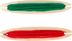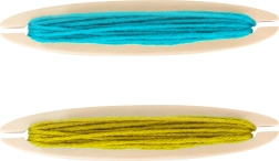 Četiri drvene špulice s raznobojnom pređom i osnovne niti omogućuju započeti stvaranje bez dodatnih kupnji – dovoljno je raspakirati i tkati.