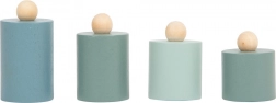 Djeca lako shvaćaju princip izravnavanja zahvaljujući dvjema zdjelama i četiri drvena utega različitih masa.