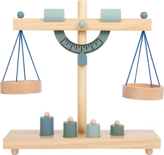 Ova stabilna drvena zdjelna vaga idealna je za dječju trgovinu i kuhinjicu. Dvije obješene zdjele i set od četiri drvena utega omogućuju djeci precizno vagati „proizvode” i razumjeti kako funkcionira ravnoteža. Pomični protutezi na rukama služe za fino podešavanje – izvrstan način za treniranje strpljenja i koncentracije.
