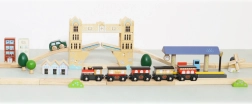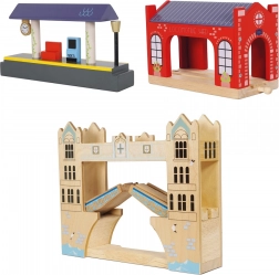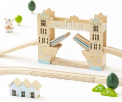 Ova velika drvena željeznička pruga vodi djecu u srce grada nadahnutog Londonom. Zahvaljujući bogatoj opremi – od kolodvora preko šarenih zgrada do kultnog podiznog mosta – nudi bezbroj igraćih scenarija i potiče otvorenu, maštovitu igru. Dva vlaka s magnetskim vagonima lako se spajaju i sigurno voze po stabilnim drvenim tračnicama.