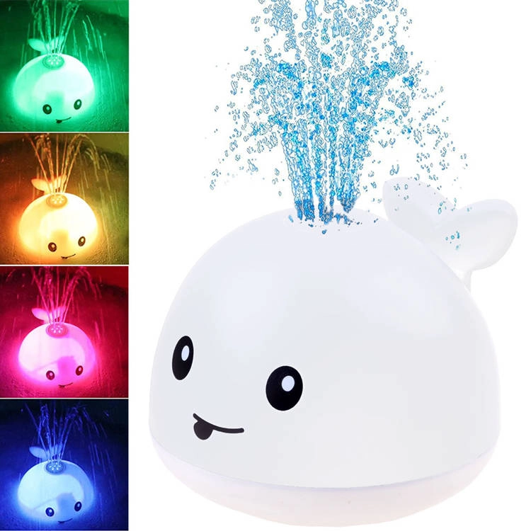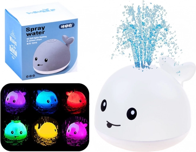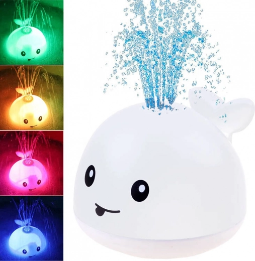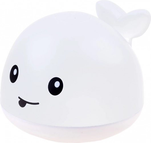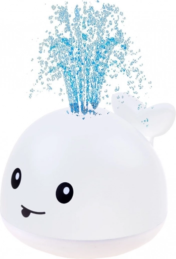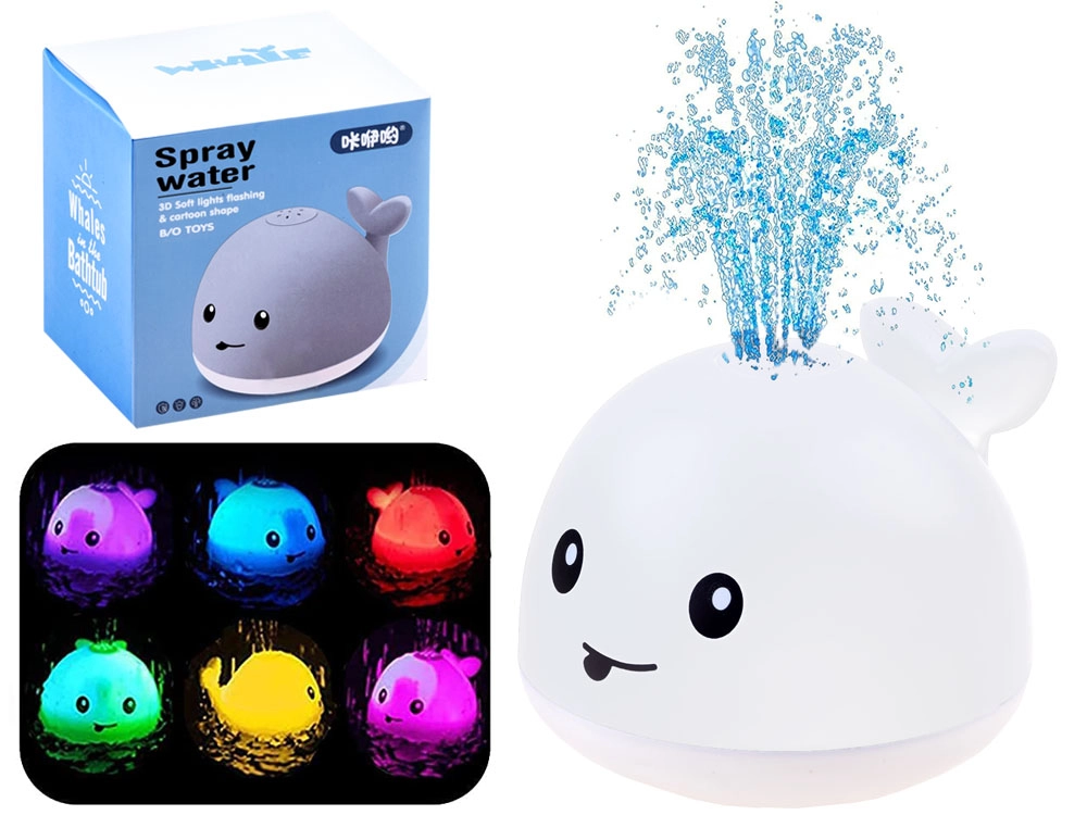 Slatki kupajući kit s mini fontanom i mijenjajućim LED svjetlima. Automatska aktivacija u vodi, kompaktne dimenzije, napajanje 3× AAA.