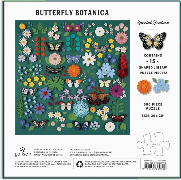 Uživajte u opuštajućem slaganju s puzzleom Butterfly Botanica od 500 dijelova, ukrašenim raznobojnim leptirima i cvijećem. Pakiranje sadrži i 15 posebno oblikovanih dijelova za još veću zabavu. Izrađeno od recikliranog papira i tiskano netoksičnim tintama u vrhunskoj kvaliteti, s dijelovima koji precizno pristaju jedni uz druge.