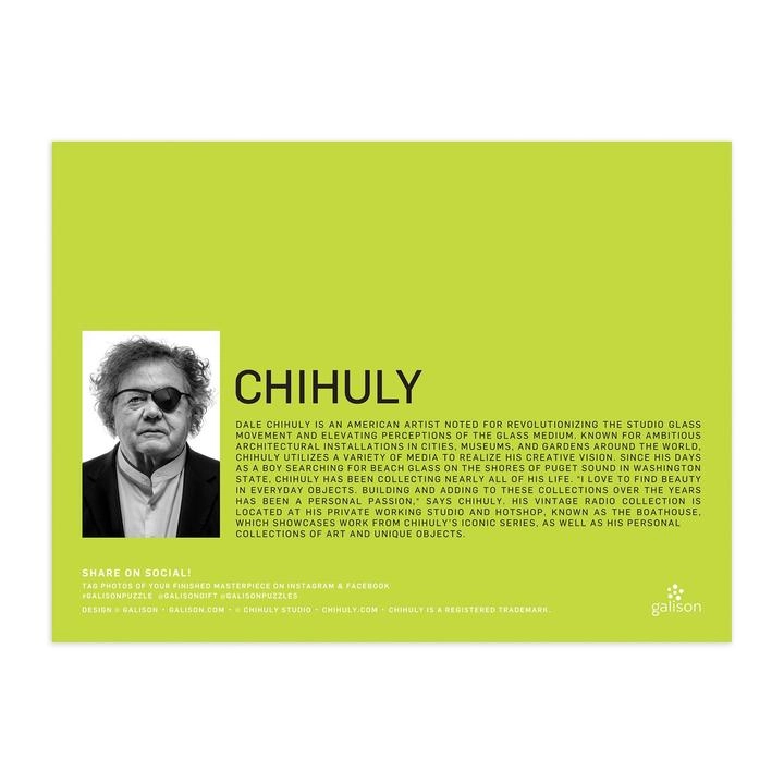 Stilske puzzle s motivom vintage prijenosnih radija oduševit će ljubitelje dizajna i kolekcionare. Umjetnik Dale Chihuly nadahnuo se svojom cjeloživotnom zbirkom, zahvaljujući čemu je nastala slika puna detalja i boja. Kvalitetan tisak i čvrsti dijelovi od recikliranog papira jamče ugodno iskustvo pri svakom slaganju.