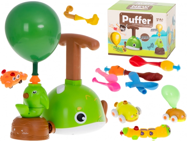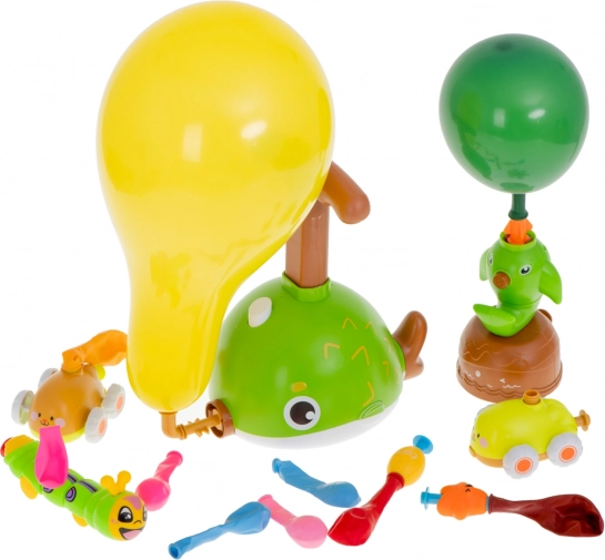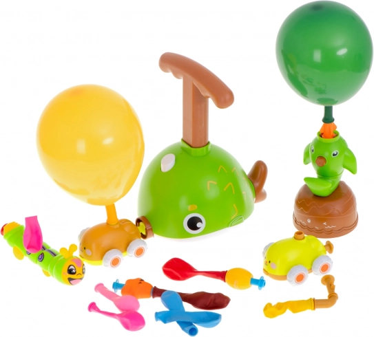 Set uključuje pumpu, 2 autića, 12 balona i zabavne dodatke (slatki morski motivi, zviždaljka, loptica i dr.). Idealno za utrke i kreativne igre.
