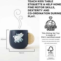 Ovaj kvalitetan dječji set za posluživanje osmišljen je da dugo traje, a ujedno izgleda prekrasno u svakoj dječjoj sobi. Elegantni plavo–bijeli motivi s ilustracijama biljaka, glatke drvene površine i sigurne boje na bazi vode čine ga idealnim izborom za svakodnevnu igru.