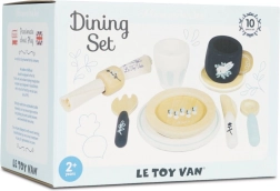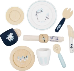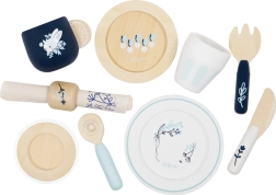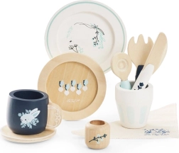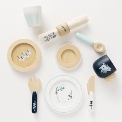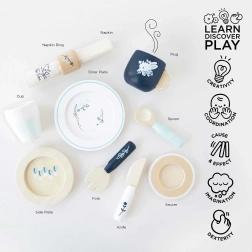 U pakiranju se nalazi sve za malo posluživanje: šalica, tanjurić, čaša, 2 tanjura, nož, vilica, žlica i tekstilna salveta s dekorativnim prstenom. Djeca tijekom posluživanja razvijaju kreativnost, spretnost i uče osnove bontona za stolom. Etički proizvedeno od održivog FSC drva s naglaskom na kvalitetu i sigurnost.