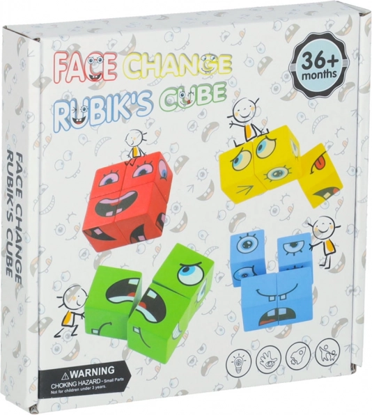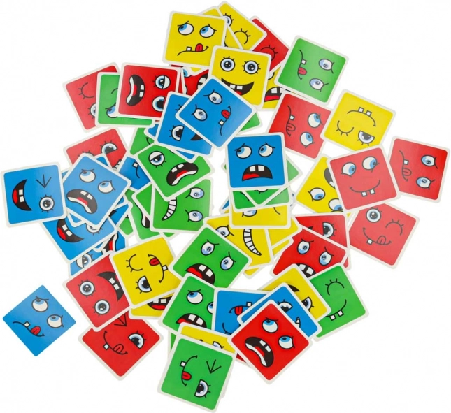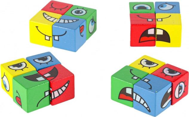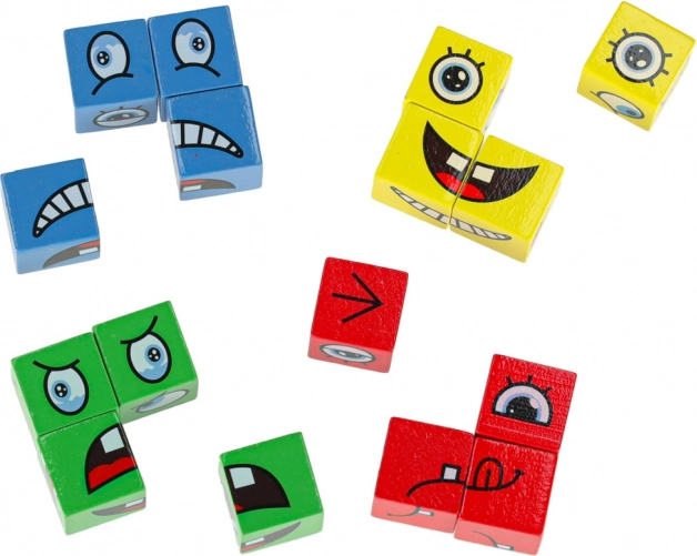 Glatko brušene kocke s tiskom očiju i usta omogućuju slaganje desetaka izraza. Čvrste, sigurne i ugodne za držanje.