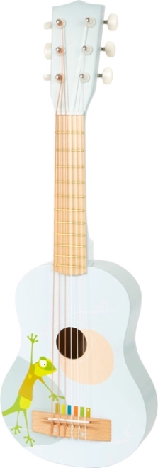 Ova kvalitetna dječja drvena gitara idealna je za male glazbenike od 3 godine. Zahvaljujući obojenim žicama djeca se lakše snalaze u tonovima i brže usvajaju prve pjesmice. Laka konstrukcija i udobna duljina od 63 cm olakšavaju držanje i sviranje.