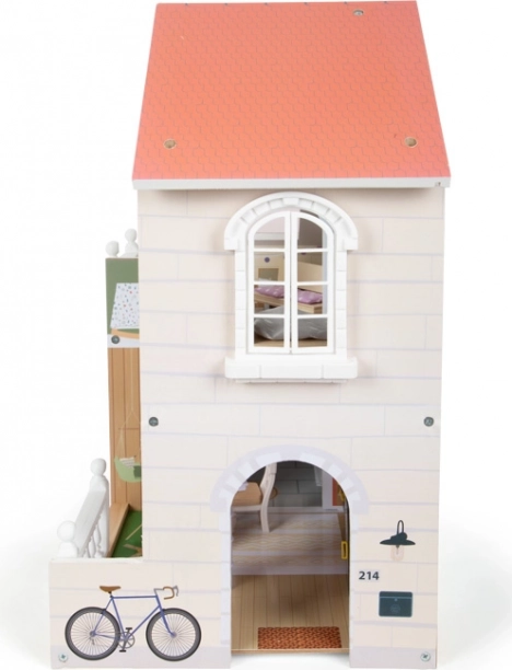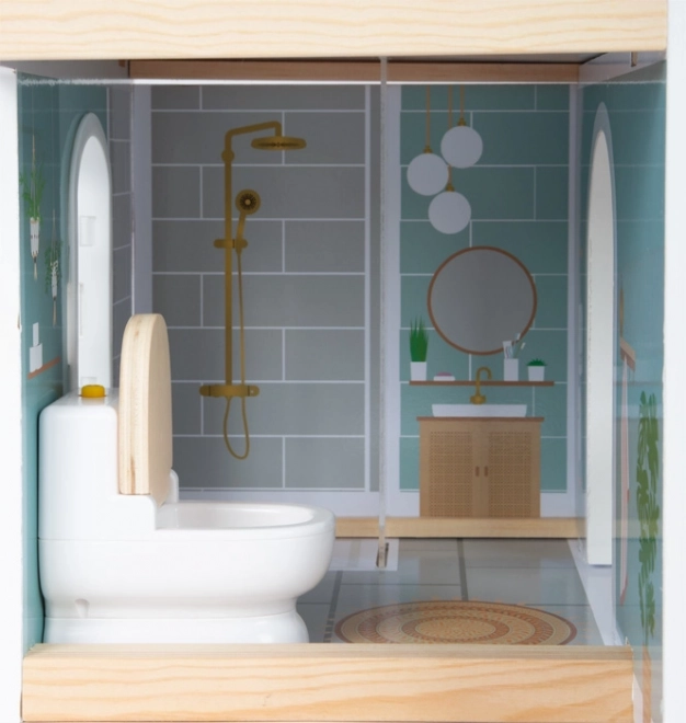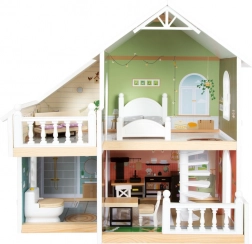 Stilna drvena kućica za lutke s otvorenom prednjom stranom nudi tri prostorije, terasu i vrt za realističnu igru. Ne nedostaje spiralno stubište, prozori koji se otvaraju, moderna kupaonica s plexi stijenkama i 8 kom funkcionalnog namještaja s tekstilnim dodacima. Kompaktna i stabilna izrada u svijetlom, modernom dizajnu idealna je za dječju ili dnevnu sobu.