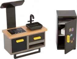 Dio kompleta je 8 komada namještaja i praktični detalji za autentičnu igru: WC školjka koja se otvara, kuhinjski ormarići i hladnjak s vratima te ladice. Tekstilni jastuci i posteljina daju spavaćoj sobi udobnost, dok spiralno stubište povezuje dva kata s promišljenim interijerom i plexi stijenkama tuša.