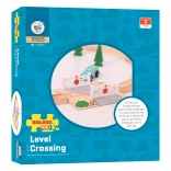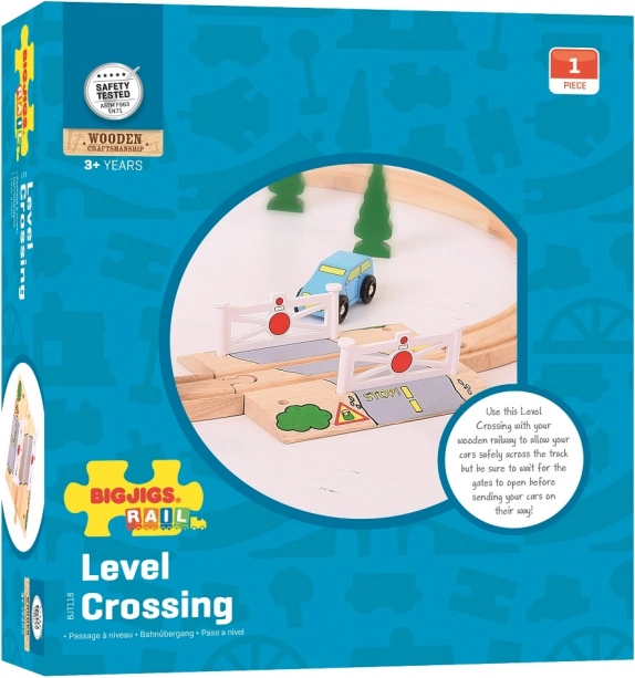 Izrađen od kvalitetnih i odgovorno dobivenih prirodnih materijala, ovaj set potiče maštu, spretnost i koordinaciju kod djece. Željeznički prijelaz ima preklopne rampe koje se savršeno uklapaju u željezničke pruge marke Bigjigs Rail, a moguće ga je kombinirati i sa svim ostalim drvenim željeznicama na tržištu.