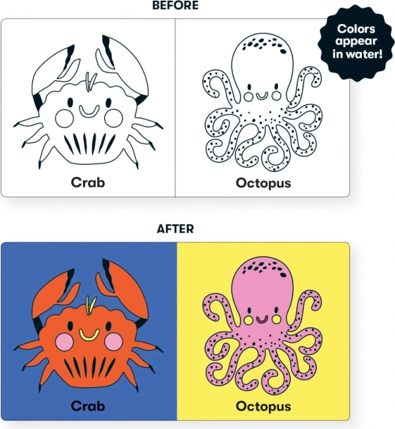 Otkrijte čaroliju jedinstvenih igračaka za kupanje. Naizgled neupadljiva slikovnica nakon namakanja slatko oživi živopisnim bojama. Lako privlači dječju pažnju i zabavlja ih tijekom kupanja, a pritom pomaže razvijati njihove kognitivne vještine. Proporcije igračke posebno su prilagođene sitnim i nespretnim dječjim ručicama. Glavne značajke: 6 stranica s ilustracijama, aktivacija boja uranjanjem u vodu, grafički dizajn Marijke Buurlage