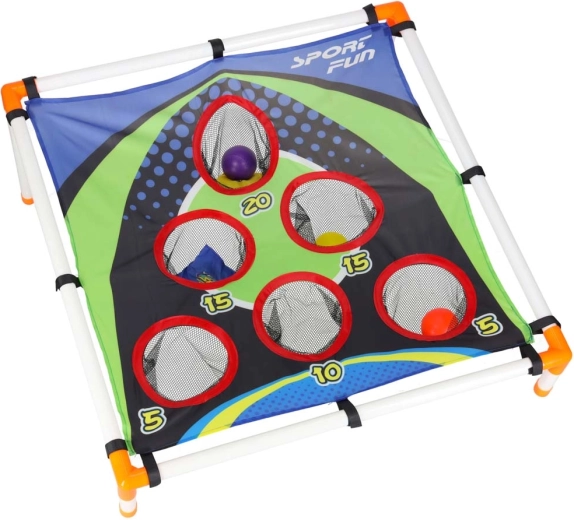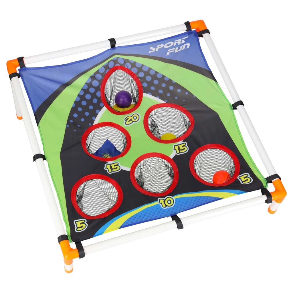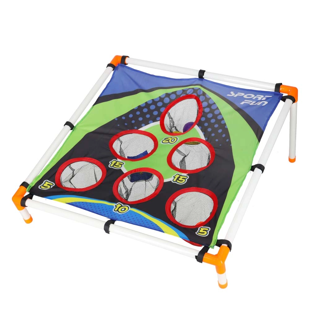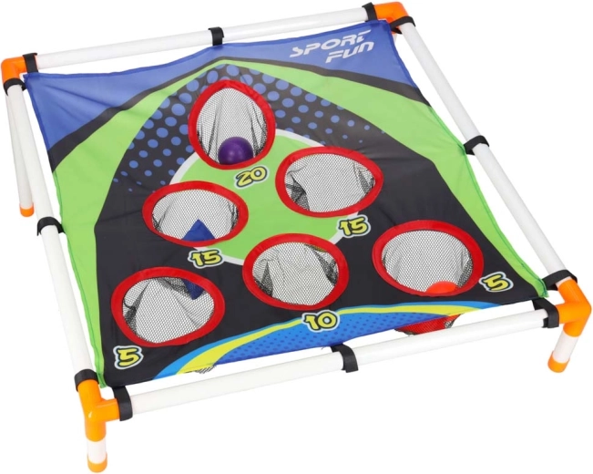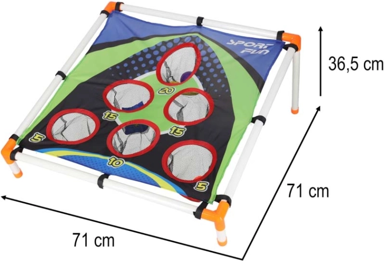 Lagana konstrukcija od plastičnih cijevi s nakošenim stalkom osigurava stabilnost, čvrsta tekstilna površina s pet do šest bodovanih otvora hvata vrećice i loptice u mrežice. Sastavljanje je intuitivno, a cijelo igralište lako ćete ponijeti bilo kamo.