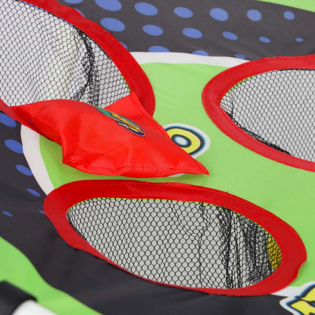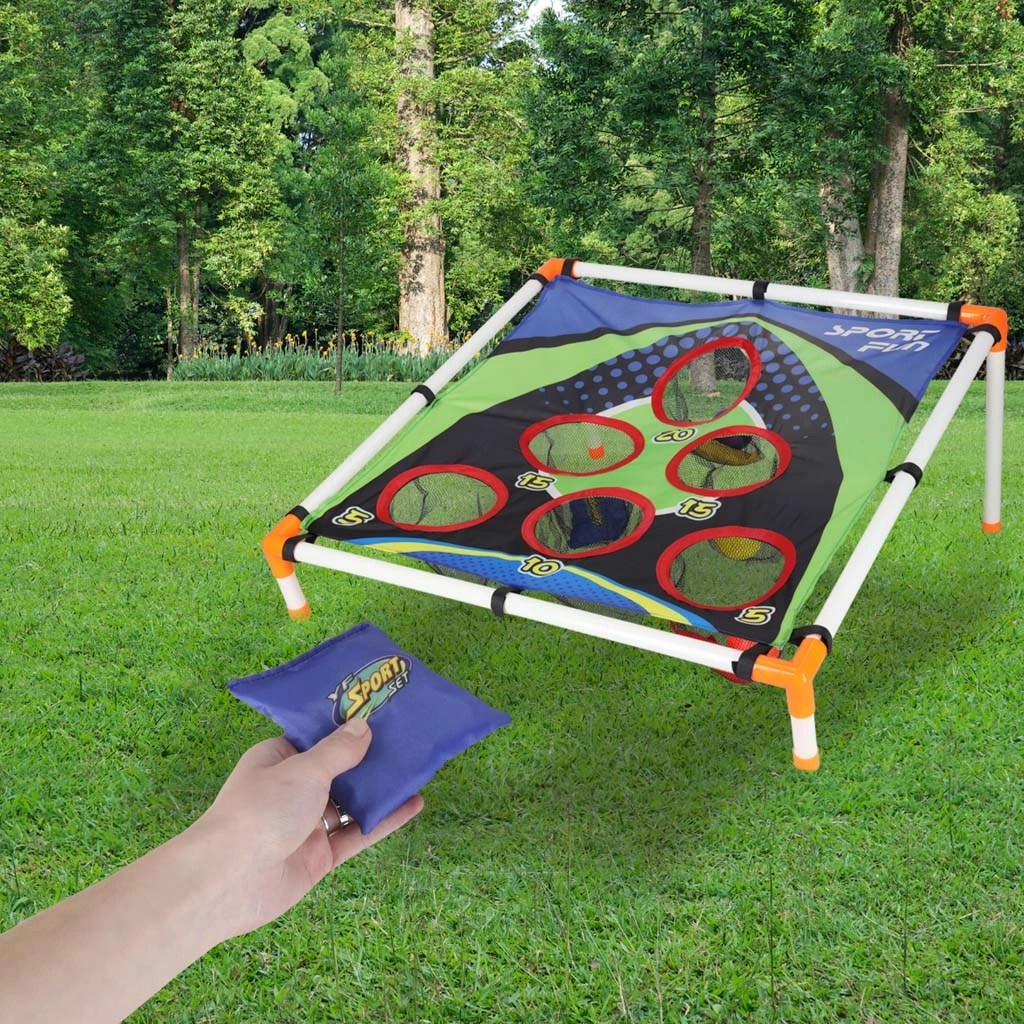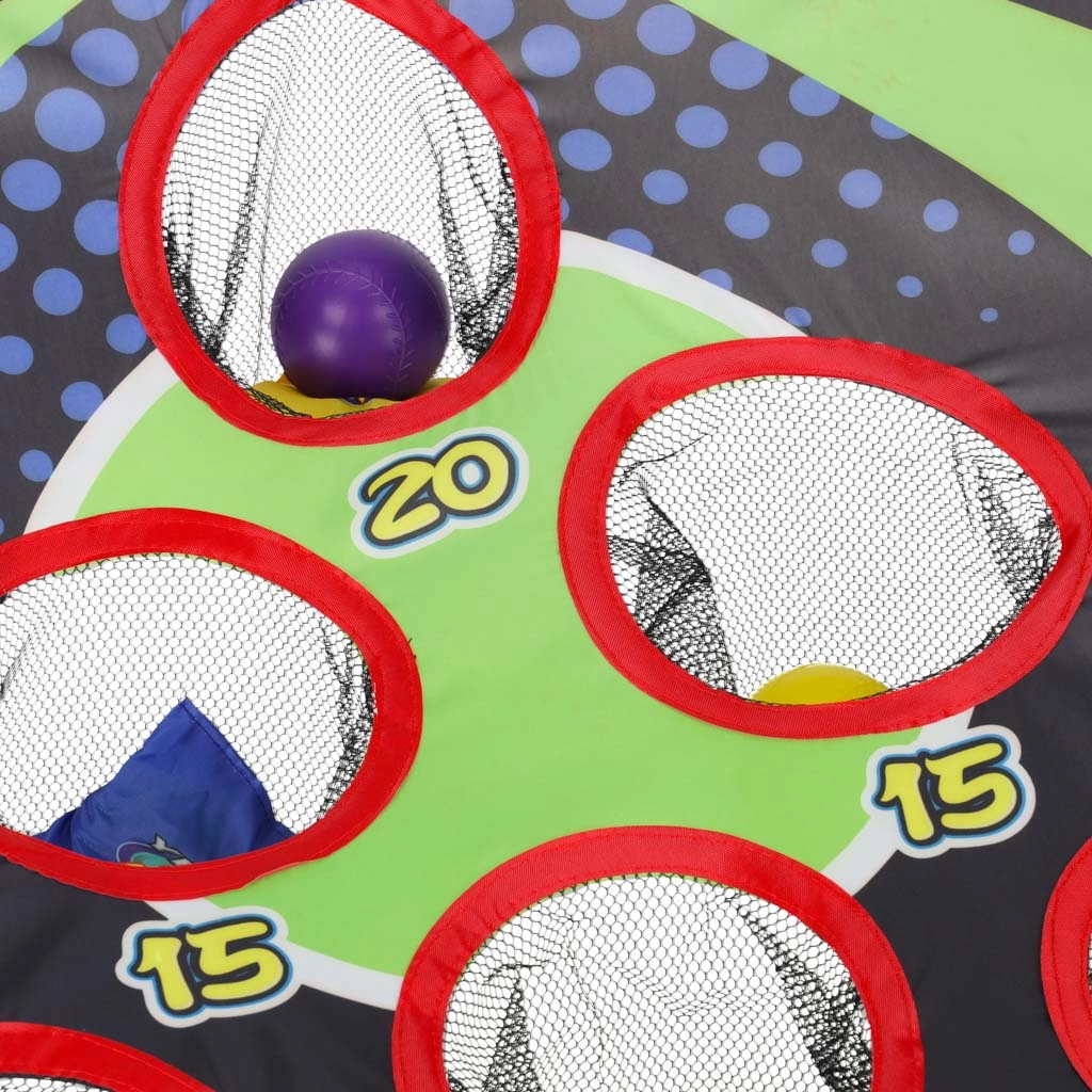 Lagana konstrukcija od plastičnih cijevi s nakošenim stalkom osigurava stabilnost, čvrsta tekstilna površina s pet do šest bodovanih otvora hvata vrećice i loptice u mrežice. Sastavljanje je intuitivno, a cijelo igralište lako ćete ponijeti bilo kamo.