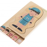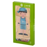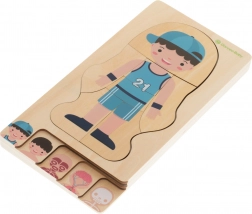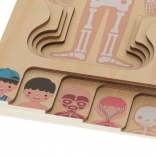 Set uključuje drvenu bazu i 28 pojedinačnih dijelova, koji se slažu od kostura do odjeće osobe. Zahvaljujući jednostavnom dizajnu i prirodnim materijalima, slagalica podržava principe Montessori metode koja se fokusira na cjelovit razvoj djeteta.